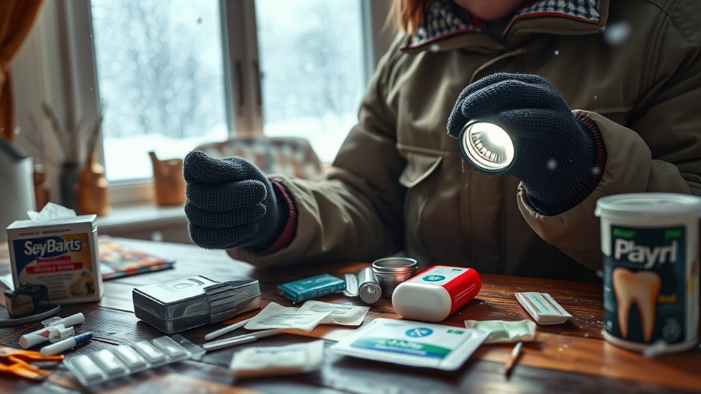 Start by assembling an emergency kit that includes essential dental supplies. This should contain items like sterile gauze, dental wax, pain relievers, and a small container of saline solution. Keep these supplies in a waterproof, easy-to-carry bag that you can grab quickly if needed. Also, include a copy of your dental history and contact information for your dentist, so you’re prepared to provide details if you need to reach out for advice remotely. Remember, your kit should be stored in a place that’s easily accessible during snowstorms, such as your main living area or a designated emergency cabinet. Additionally, understanding local healthcare resources can help you navigate available options during severe weather conditions.