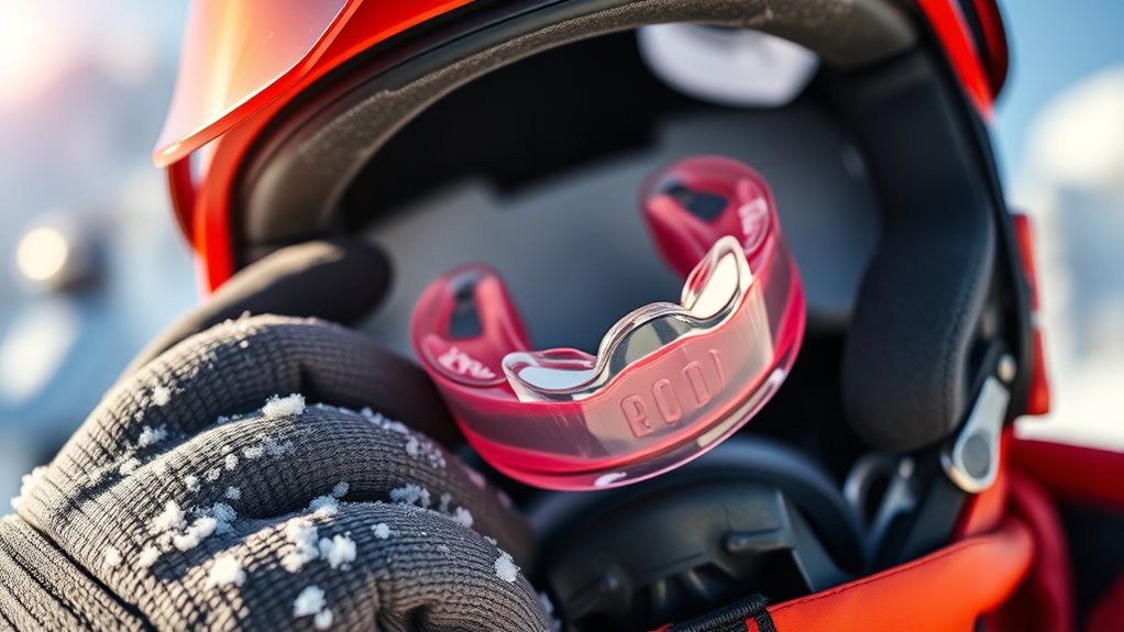 Wearing a properly fitted mouthguard is essential for winter sports like ice skating and snowboarding, where falls and collisions happen often. A good mouthguard absorbs shocks, protects your teeth from chips or knocks, and shields soft tissues from cuts. Choosing a snug, impact-resistant guard—whether custom-made or boil-and-bite—can substantially lower your injury risk and save you from costly dental repairs later. Keep exploring to discover tips on selecting the best mouthguard for your winter adventures.