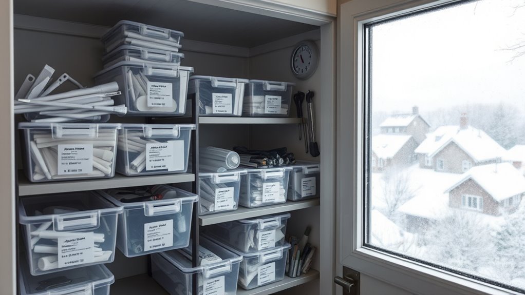 Yes, you should use airtight containers and insulated storage for dental supplies during winter. Airtight containers prevent moisture from entering and damaging items, while insulated storage helps maintain a consistent temperature, protecting against cold fluctuations. Place these containers in a cool, dry, and stable environment, avoiding direct contact with windows or exterior walls. This approach guarantees your supplies stay dry, preserved, and ready for use when needed.