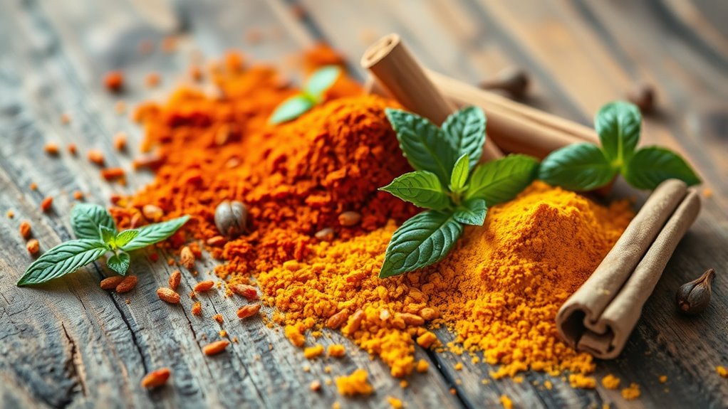 To fight bad breath naturally, try incorporating warm spices like cinnamon, cloves, and cardamom into your daily routine. Chewing a cinnamon stick or adding these spices to your tea helps eliminate odor-causing bacteria directly in your mouth. Cloves and cardamom act as natural breath fresheners by targeting bacteria at a microbial level. Keep exploring how these flavorful remedies can boost your oral freshness and confidence every day.