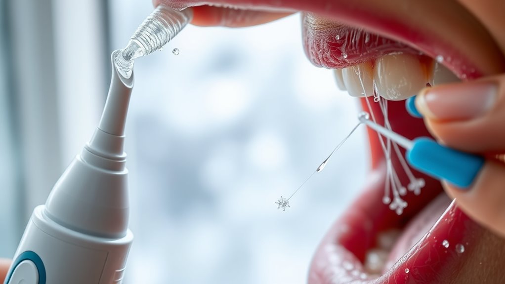 In winter, water flossers often feel more convenient and gentler, especially if you experience joint discomfort or sensitive gums from the cold. They make it easier to reach tight spaces without the fuss of manual dexterity required for traditional floss. If you want a comfortable, effective way to keep your mouth healthy during colder months, water flossers might be the better choice. Keep exploring to discover how each method can best suit your winter oral care routine.