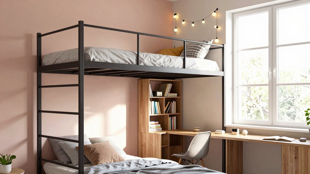 You’ll want to ensure your child is tall enough and strong enough to climb up and down safely without risking falls. Younger children, especially those under six, often lack the coordination and judgment needed to navigate a loft bed confidently. Even if they’re tall for their age, their maturity level matters — can they follow safety instructions, stay within the bed’s boundaries, and avoid risky behavior? If not, it’s better to wait until they’re more responsible. Safety considerations extend beyond just height; you should also think about whether your child can handle the potential hazards of the upper bunk, such as falling or climbing down safely in the middle of the night.
