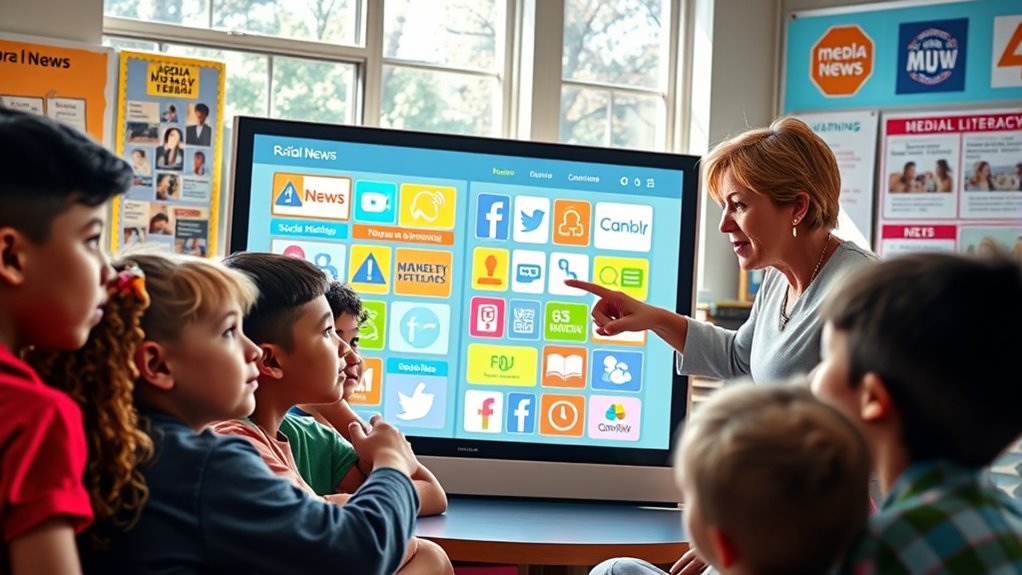 To help kids recognize fake news and build media literacy, encourage them to question online content by analyzing sources and verifying facts through multiple reputable outlets. Model critical thinking by verbalizing your own evaluation process and prompt discussions about media manipulation. Teach them to look for signs like author credentials and suspicious visuals. Developing these habits helps children become confident, critical consumers of digital information and lays a strong foundation for spotting misinformation—keep exploring for more tips.