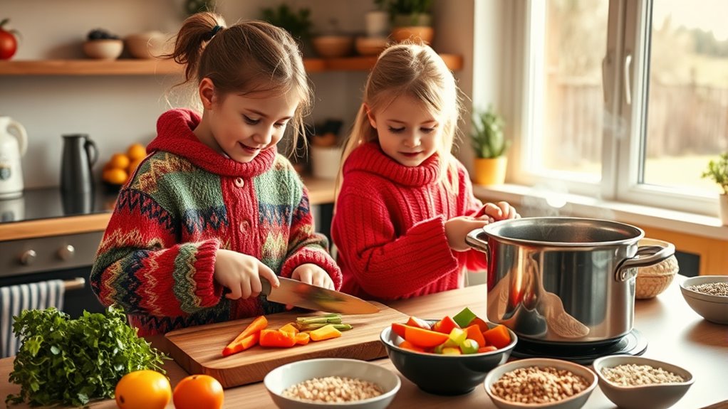 Encouraging kids to plan and cook healthy winter meals helps them develop important skills, confidence, and better eating habits. Start with simple recipes using seasonal ingredients like root vegetables and hearty greens, and make safety a priority by teaching proper knife handling and supervision around hot appliances. Get them involved in ingredient prep and presentation to spark their interest and creativity. Keep exploring, and you’ll discover more ways to make healthy winter cooking fun and safe for your kids.