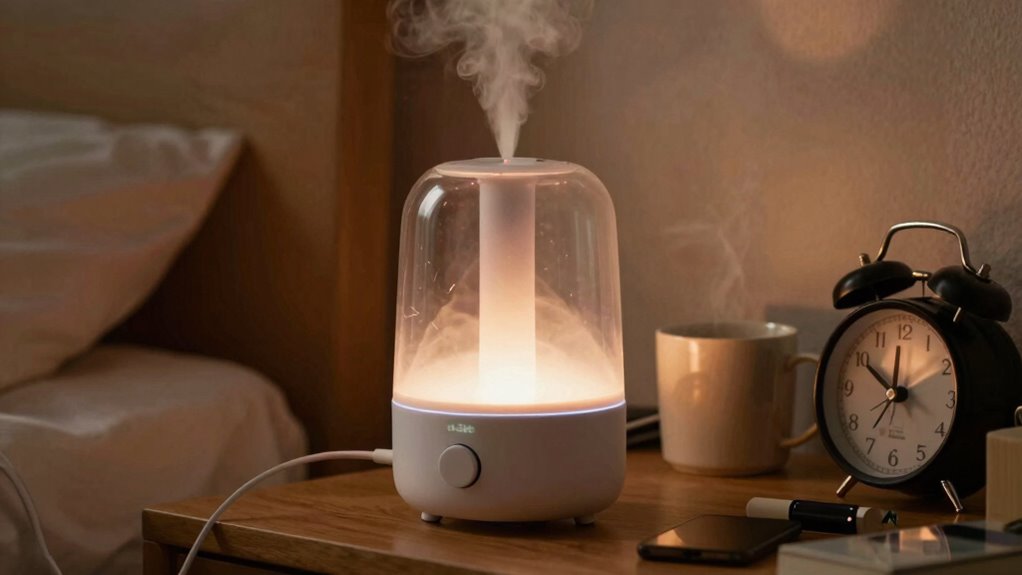 A humidifier that’s too small can considerably disrupt your sleep by failing to maintain proper indoor moisture levels throughout the night. When room humidity levels drop, you might wake up feeling dry, restless, or stuffy. The humidifier’s effectiveness diminishes, causing uneven moisture distribution. As a result, your sleep quality suffers, leaving you tired and less alert. Additionally, improper humidity levels can lead to rug wear and tear, especially in high-traffic areas, further impacting your interior comfort. Using an undersized humidifier can also cause inefficient moisture output, making it difficult to achieve consistent humidity levels in your space. A small humidifier may also struggle to adapt to changes in room size or environmental conditions, reducing its overall efficiency. You may notice:
