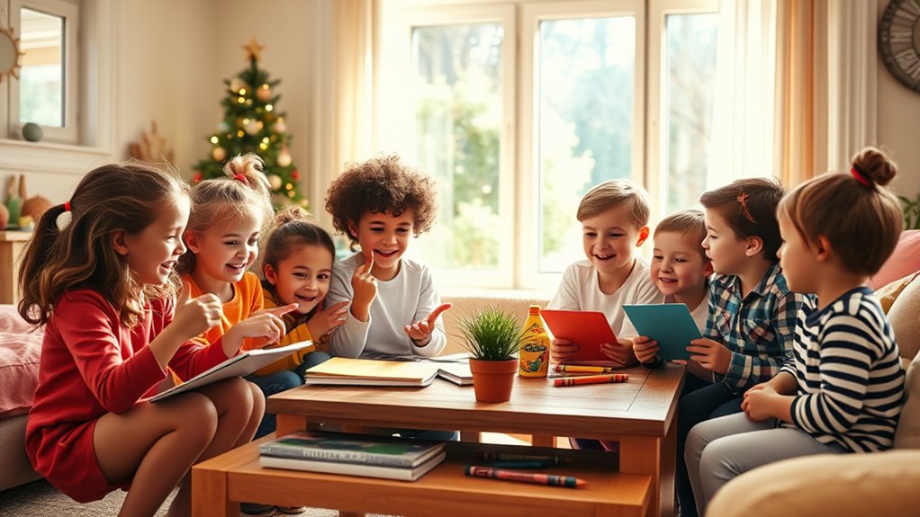 You can make the resolution discussion fun for kids by incorporating creative activities and fun challenges. Turn goal-setting into a game, like a scavenger hunt for ideas or drawing their resolutions. Use colorful charts or stickers to track progress, making it visually engaging. Celebrate small wins with rewards or cheers, encouraging enthusiasm. Turning it into an interactive, playful experience helps kids stay excited and motivated about their resolutions.