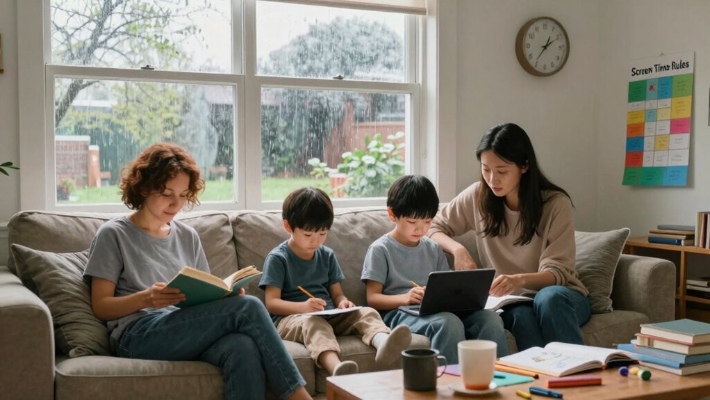 Imagine you’re captaining a ship, steering through stormy waters. When children resist screen-time rules, you’re practicing parent-child negotiation, setting boundaries like sturdy anchors. Calmly explain your reasons, listen to their concerns, and find common ground. Reinforce that these boundaries keep your family ship steady, safe, and happy. By showing understanding and firmness, you build trust, making it easier for kids to accept and respect the rules during rainy spring weekends.