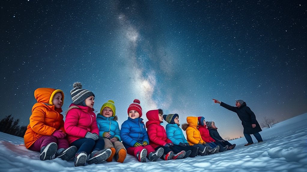 As you guide them through naming stars and sharing constellation myths, keep the atmosphere fun and interactive. Use a flashlight with a red filter to preserve night vision, and point out the brightest stars first, gradually progressing to more complex patterns. Consider using a star chart or a stargazing app designed for beginners to help them navigate and understand what they’re seeing. Ask questions like, “Can you find the shape of a hunter or a bear?” to make the activity more participatory. Over time, your kids will start recognizing familiar shapes and recalling the stories behind them, deepening their appreciation of winter skies. Additionally, understanding the concept of naming stars and constellation myths can foster a deeper interest in astronomy and the night sky.
