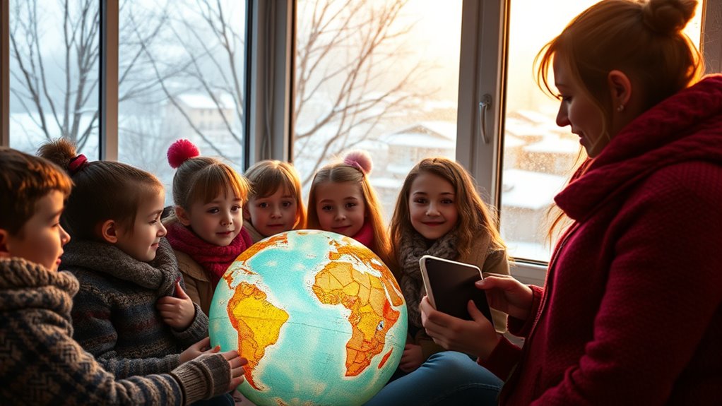 You can make learning about climate concepts fun with winter activities like ice skating and snowman building. While ice skating, explain how melting ice affects our planet’s temperatures, showing how climate change impacts winter sports. Building snowmen helps kids understand snow patterns and how warming temperatures can reduce snowfall. These engaging activities make climate ideas tangible, encouraging curiosity and awareness while enjoying winter weather together.