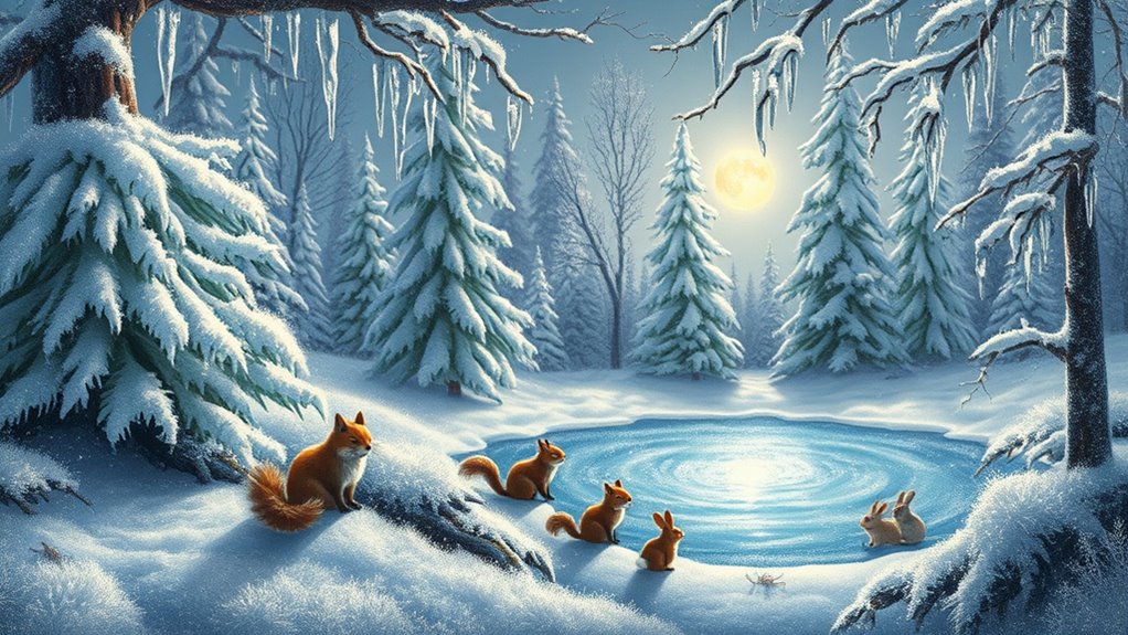 During cold winter nights, the forest friends stay warm by snuggling inside animal burrows and dens, where the temperature stays more stable. They also feast on winter berries, which provide energy and help maintain their warmth. These clever creatures huddle together, sharing body heat, and use thick fur or feathers to insulate themselves. This way, they survive the frosty nights comfortably, staying cozy until morning.