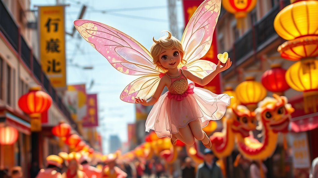 Imagine the Tooth Fairy joining a Lunar New Year parade by donning a costume inspired by mythical creatures like dragons or phoenixes, blending her fairy magic with traditional Asian folklore. She twirls through vibrant floats, her wings shimmering among lanterns and colorful banners, while storytelling performers bring legends to life. Her presence symbolizes luck and prosperity, bridging two worlds with joy. Keep exploring further to see how this enchanting collaboration celebrates tradition and creativity.