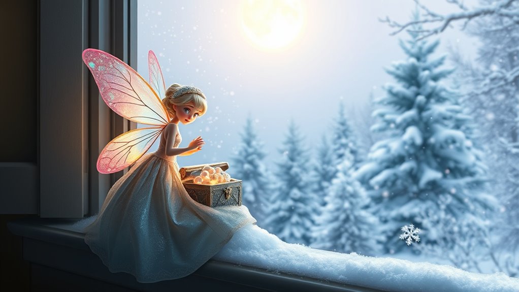 The Tooth Fairy still visits during snowstorms and bad winter weather. She’s dedicated to fairy visits regardless of the conditions, ensuring children’s smiles stay bright. You might notice her more carefully steering icy streets or snowy yards, but her commitment remains strong. Whether it’s a blizzard or a clear night, the fairy’s magical presence endures, making sure your child’s tooth exchange happens smoothly despite any winter weather.