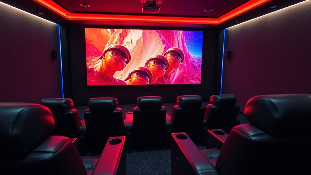 A smart operating system can considerably enhance your home theater experience by providing easy access to streaming apps and intuitive controls. With built-in apps like Netflix, YouTube, and Prime Video, you don’t need extra devices, making setup simpler. Support for voice commands via Google Assistant or Alexa allows you to search and control content hands-free, adding convenience. Regular firmware updates improve security, fix bugs, and introduce new features, ensuring your projector stays current. Compatibility with screen mirroring protocols like AirPlay, Miracast, or Chromecast makes sharing content from smartphones or tablets effortless. A user-friendly interface with straightforward menus and quick app access simplifies daily operation and setup, helping you focus on enjoying stunning 4K visuals without fuss. The right OS features can truly elevate your home theater experience.