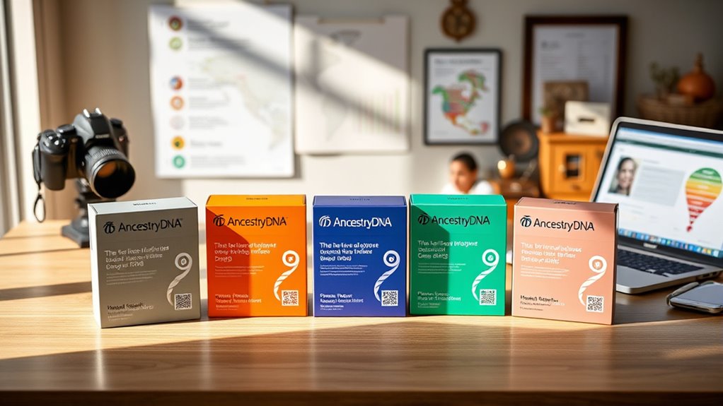 When choosing an AncestryDNA kit, it’s important to evaluate the overall cost and what you’re getting in return. Consider the total price, including optional subscriptions or added features, to determine true value. Look for bundle deals that combine testing with access to family trees or detailed reports—these often save money and enhance your experience. Compare the kit’s price against the depth of results and insights provided to ensure it meets your research goals. Be mindful of hidden costs like shipping fees or subscription renewals that could increase the overall expense. Ultimately, a higher price doesn’t always mean better value; focus on whether the features and reports align with your needs, giving you the most thorough and cost-effective insights.